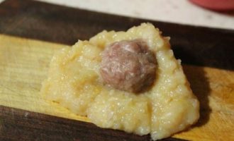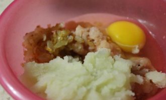 • Куриное филе измельчить в мясорубке. Луковицу нарезать кубиками и обжарить в масле до золотистого цвета, остудить и добавить в фарш, туда же вбить яйцо, добавить картофельное пюре, посолить и поперчить. Два разных фарша готовы.