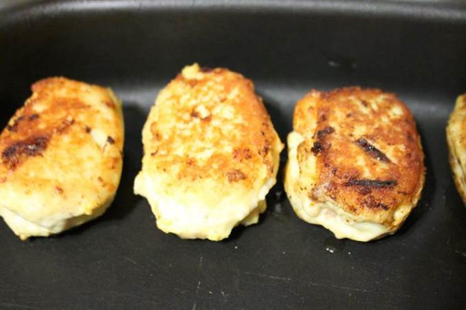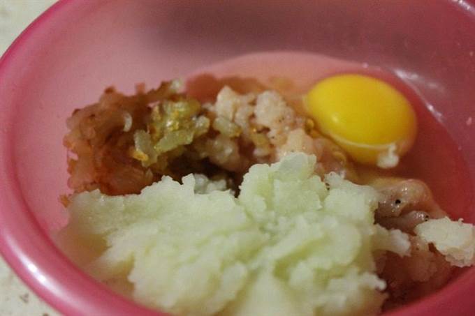 • Куриное филе измельчить в мясорубке. Луковицу нарезать кубиками и обжарить в масле до золотистого цвета, остудить и добавить в фарш, туда же вбить яйцо, добавить картофельное пюре, посолить и поперчить. Два разных фарша готовы.