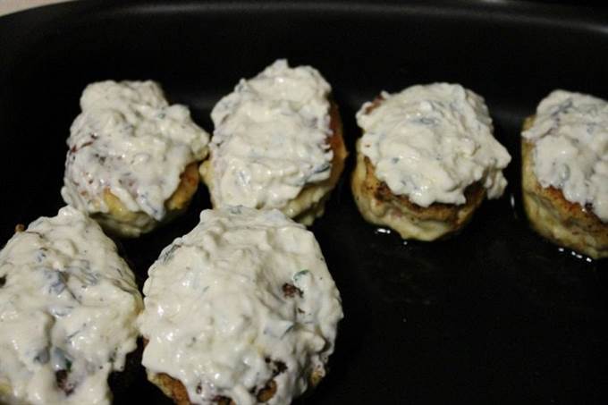 • Для соуса: сыр натереть на крупной терке, чеснок пропустить через пресс, зелень мелко порубить, добавить сметану и майонез, посолить и поперчить по вкусу, все хорошенечко перемешать. И обмазать соусом наши котлетки. Запекать в заранее разогретой до 180 градусов духовке 15-20 минут.