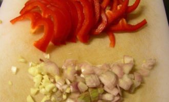 Лук и чеснок режем мелко, перец — тонкими полосочками.