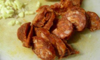 Чоризо режем кружочками.