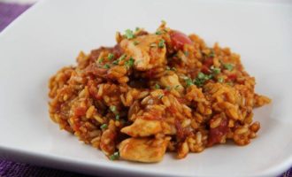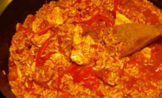 Всыпаем рис, возвращаем курицу в сковороду (у меня коричневый рис, он готовится дольше длиннозернового, поэтому я курицу добавляла попозже). Добавляем помидоры и бульон. Накрываем блюдо крышкой и готовим на небольшом огне минут 25 до мягкости риса.