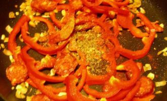 Добавляем чеснок, перец, чоризо, и смесь специй. Готовим минут 5.