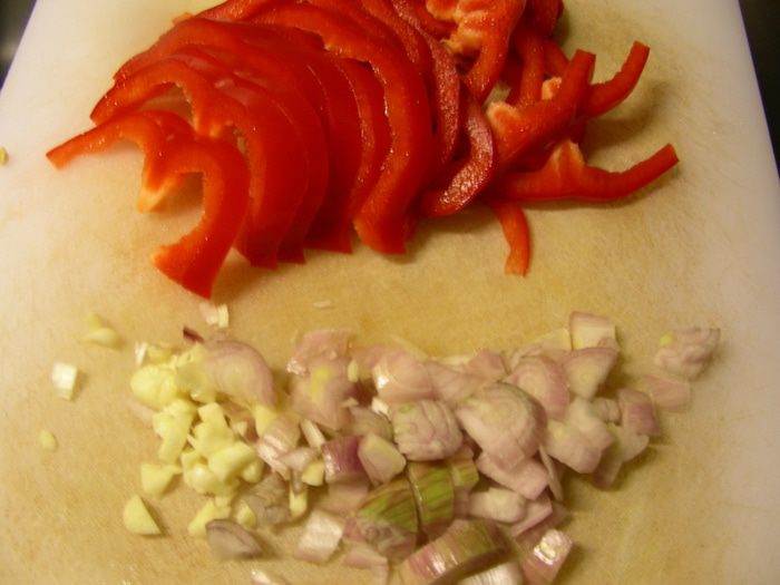 Лук и чеснок режем мелко, перец — тонкими полосочками.