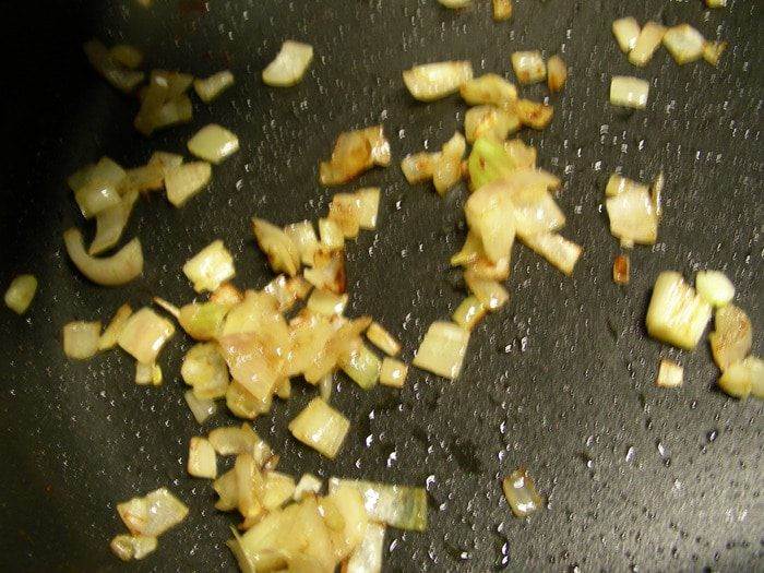 В той же сковороде обжариваем лук 3-4 минуты до мягкости.