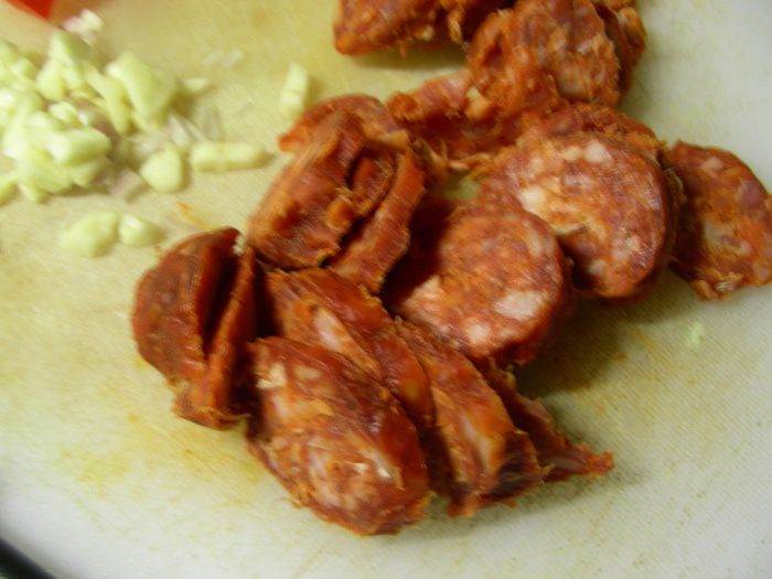 Чоризо режем кружочками.