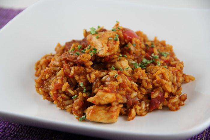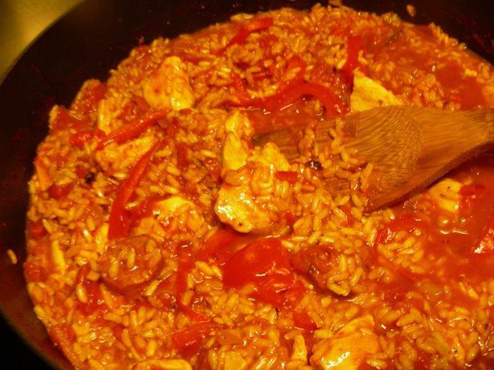 Всыпаем рис, возвращаем курицу в сковороду (у меня коричневый рис, он готовится дольше длиннозернового, поэтому я курицу добавляла попозже). Добавляем помидоры и бульон. Накрываем блюдо крышкой и готовим на небольшом огне минут 25 до мягкости риса.