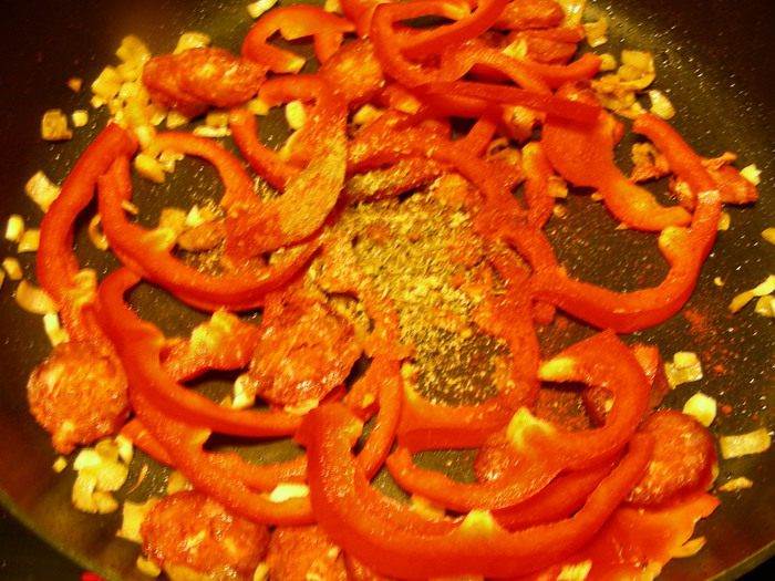 Добавляем чеснок, перец, чоризо, и смесь специй. Готовим минут 5.
