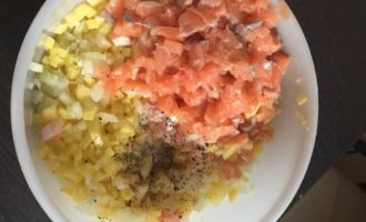 • Животики и филе режем на кусочки. Если мясо, резали бы мельче. Рыбу можно покрупнее 1 см. Естественно, все косточки и шкурки убираем.