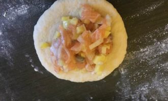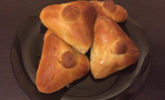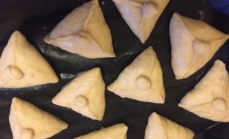 • Готовое тесто обминаем. Делим на кусочки 50 — 60 граммов. Раскатываем, кладем начинку, защипываем треугольником. Сверху приклеиваем крышечку.