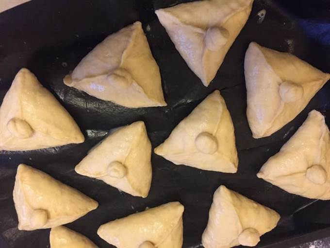 • Готовое тесто обминаем. Делим на кусочки 50 — 60 граммов. Раскатываем, кладем начинку, защипываем треугольником. Сверху приклеиваем крышечку.