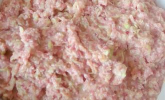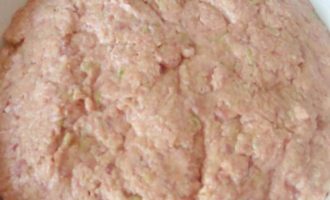 Добавить мясной фарш, у меня смесь говяжьего и свиного. Как следует все перемешать. Отбить такой фарш не получится, он еще довольно жидкий.