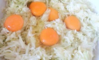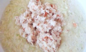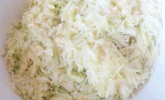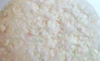 Посолить немного и дать настояться, чтобы кабачок пустил сок, а хлеб окончательно размяк. Из такой смеси можно печь оладушки уже.