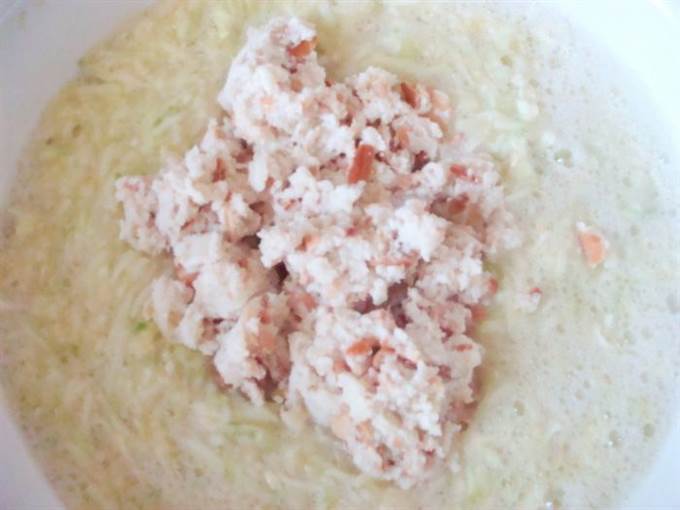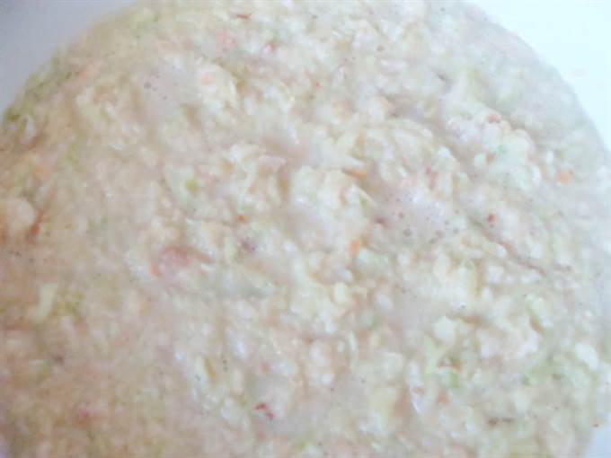 Посолить немного и дать настояться, чтобы кабачок пустил сок, а хлеб окончательно размяк. Из такой смеси можно печь оладушки уже.