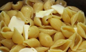 Отварить ракушки в подсоленной воде 10-12 минут, добавить сливочное масло, перемешать.
