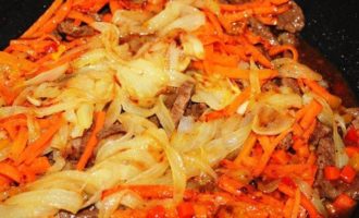 Затем выложить обжаренные куски мяса в глубокую сковороду, сверху разложить морковь и лук, залить 1 стаканом горячей воды, посолить, поперчить.