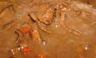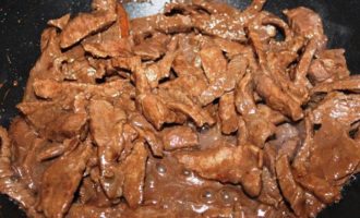 Залить мясо этим соусом, перемешать и тушить еще 30 минут.