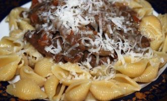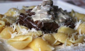 Блюдо готово… подавать следует обязательно горячим… выложить на тарелку ракушки, сверху бефстроганов с подливкой, присыпать сыром Пармезан.