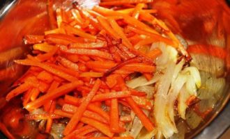 Лук и морковь очистить, нарезать на длинные кусочки и обжарить на топленом сливочном масле с добавлением сахара. Лук и морковь лучше пассеровать раздельно друг от друга. Выложить в миску.