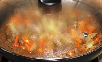 Накрыть крышкой и тушить на медленном огне примерно 1 час.