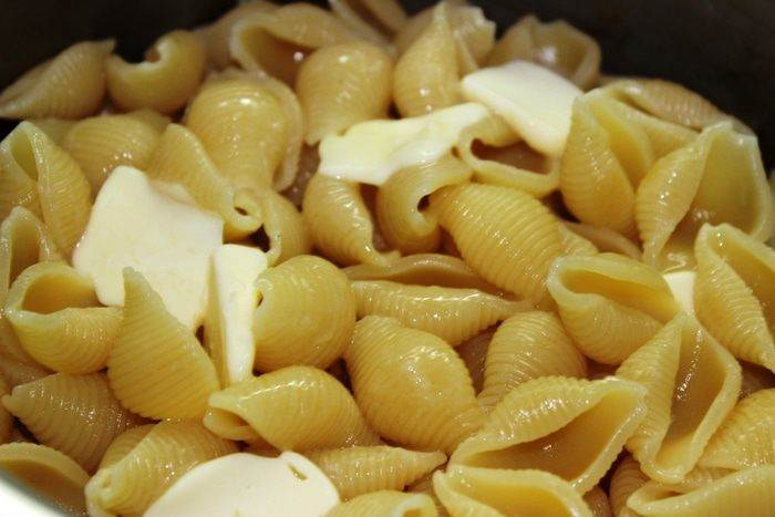 Отварить ракушки в подсоленной воде 10-12 минут, добавить сливочное масло, перемешать.