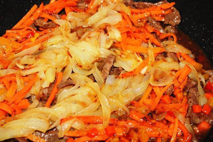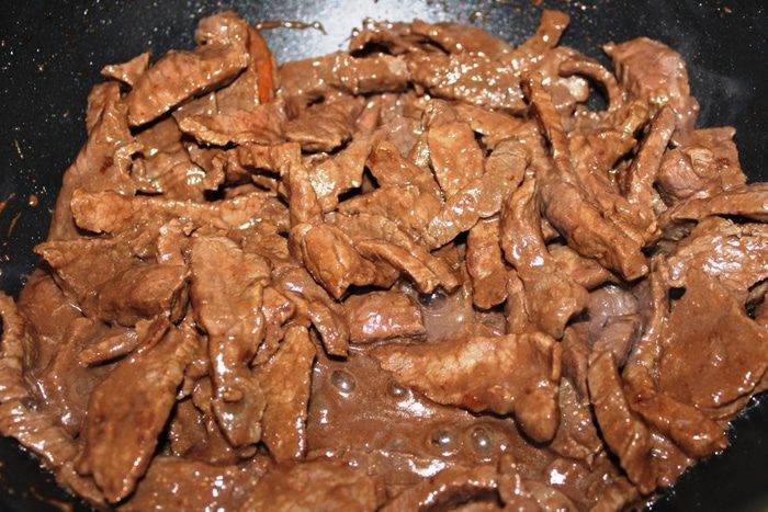 Телятину хорошо промыть и нарезать на длинные полоски поперек волокон мяса (это важно, т. к. мясо получается очень мягким). Для начала необходимо мясо обсушить и поджарить при сильном огне на той же сковороде, где пассеровали лук и морковь. Кусочки должны обжариться только сверху, поэтому необходимо жарить его небольшими порциями. Каждую порцию после обжарки складывать в отдельную миску.