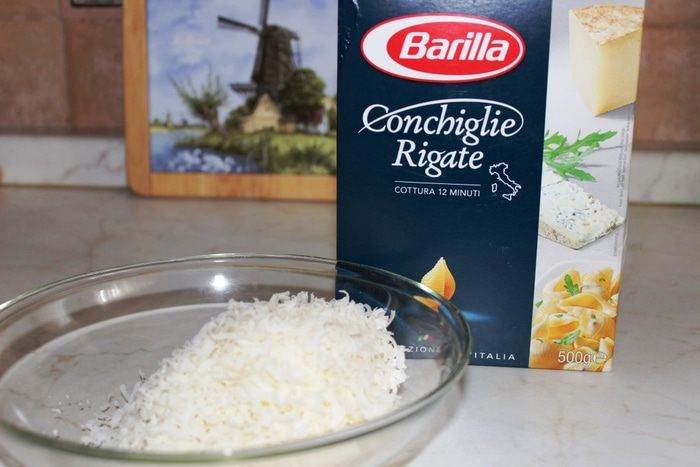 Для гарнира взять пасту Конкилье, натереть сыр Пармезан.