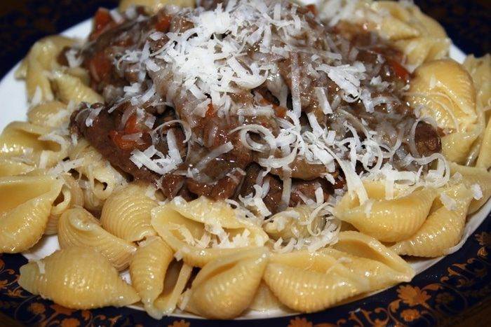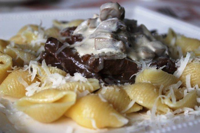 Блюдо готово… подавать следует обязательно горячим… выложить на тарелку ракушки, сверху бефстроганов с подливкой, присыпать сыром Пармезан.
