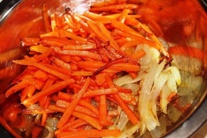 Лук и морковь очистить, нарезать на длинные кусочки и обжарить на топленом сливочном масле с добавлением сахара. Лук и морковь лучше пассеровать раздельно друг от друга. Выложить в миску.