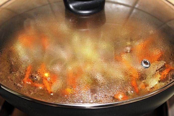 Накрыть крышкой и тушить на медленном огне примерно 1 час.