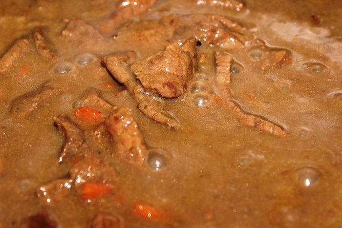 Залить мясо этим соусом, перемешать и тушить еще 30 минут.