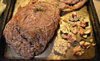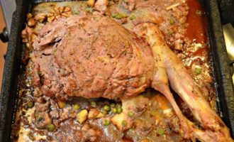 Налейте в противень оливковое масло, уложите баранью ногу, разрезанную пополам большую головку чеснока. Посыпьте сухим розмарином и поставьте в сильно разогретую духовку (до 230°С) на 10 — 15 мин, чтобы мясо равномерно поджарилось со всех сторон. Для этого периодически поворачивайте ногу на противне.