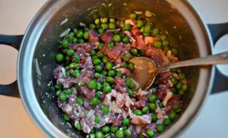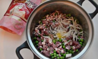 Для начинки соедините в кастрюле порезанное мясо, размороженный зеленый горошек, тертый сыр и яйцо.