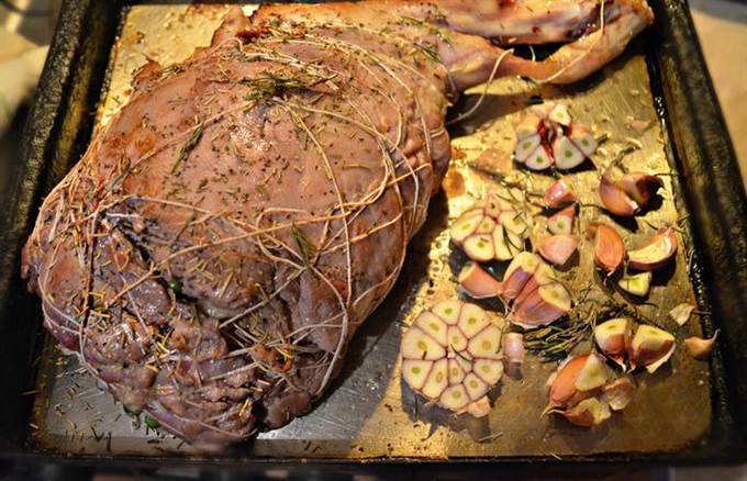 Налейте в противень оливковое масло, уложите баранью ногу, разрезанную пополам большую головку чеснока. Посыпьте сухим розмарином и поставьте в сильно разогретую духовку (до 230°С) на 10 — 15 мин, чтобы мясо равномерно поджарилось со всех сторон. Для этого периодически поворачивайте ногу на противне.