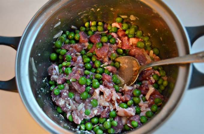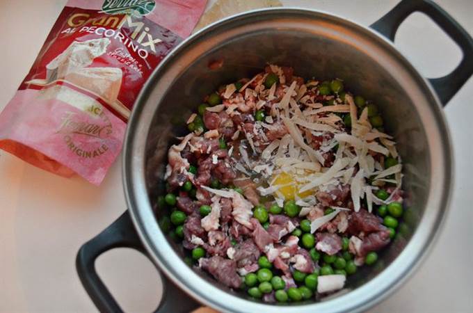 Для начинки соедините в кастрюле порезанное мясо, размороженный зеленый горошек, тертый сыр и яйцо.