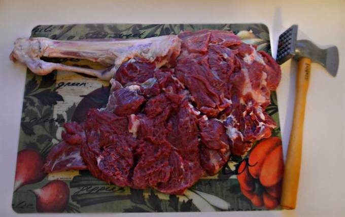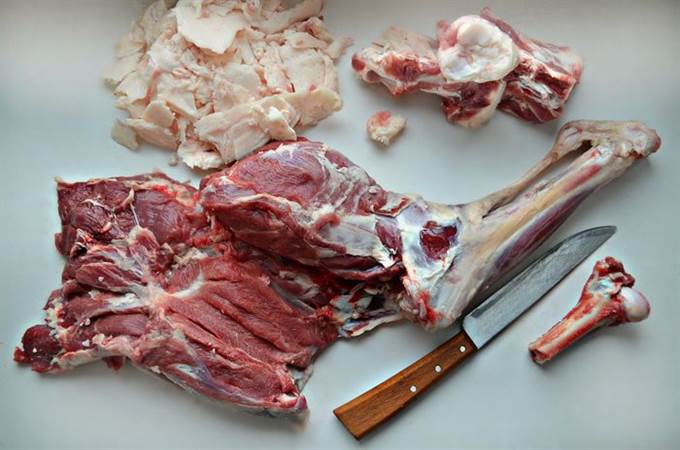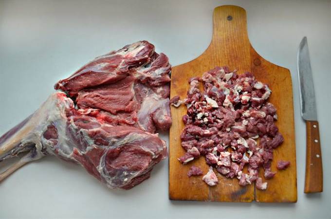 Откройте баранью ногу, подровняйте края и нарежьте на мелкие кусочки обрезки мяса.