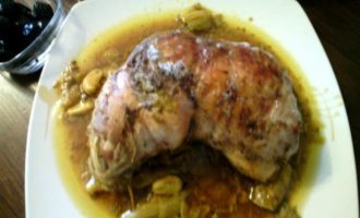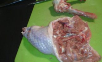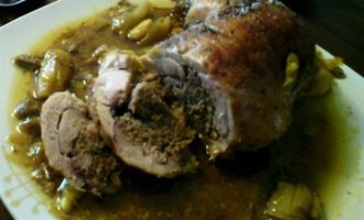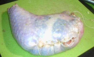 Смазать соевым соусом мясо индейки, наполнить фаршем, зашить по краям всё бедро.