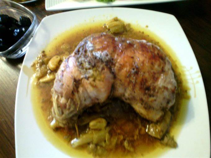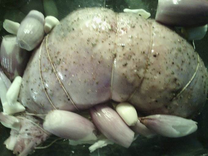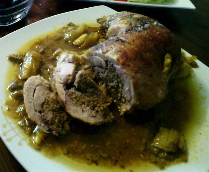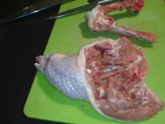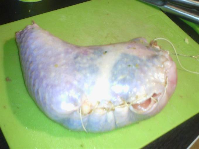 Смазать соевым соусом мясо индейки, наполнить фаршем, зашить по краям всё бедро.