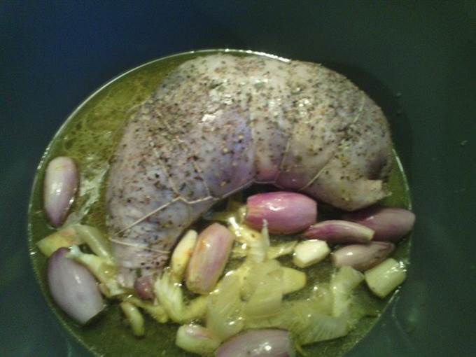Переложить в кастрюлю с толстым дном, добавить воду. Накрыть крышкой и готовить на медленном огне 1 ч. 40. мин.
