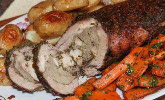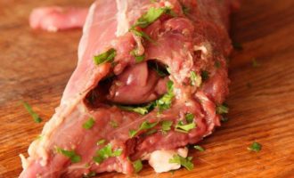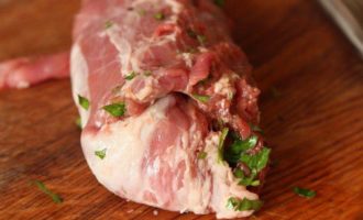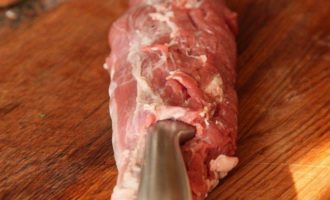Берем свиное филе и острый нож с тонким длинным лезвием, прорезаем филе с одного конца и осторожно продвигаем лезвие ножа так, чтобы не прорезать филе насквозь, продвигаясь ножом в стороны и вперед, как бы нанизывая филе как на шампур. Должно получиться вот так. До второго конца не дорезаем, чтобы рулет был закрытым.