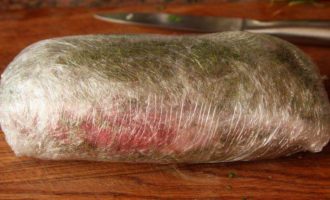 Тщательно упаковываем в несколько слоев пищевой пленки (не жалеем) и получаем кокон.