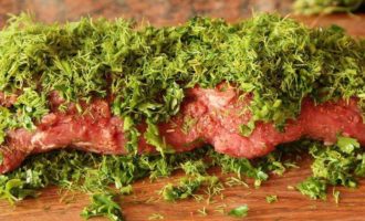 Выстилаем пищевую пленку, сверху выкладываем рубленую петрушку и укроп, затем наше филе и снова рубленую зелень.