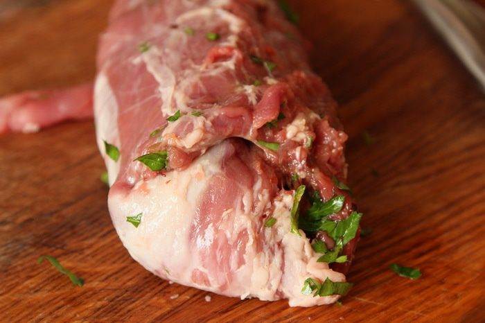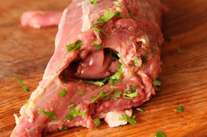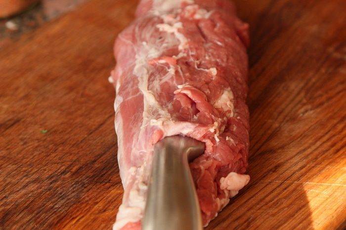 Берем свиное филе и острый нож с тонким длинным лезвием, прорезаем филе с одного конца и осторожно продвигаем лезвие ножа так, чтобы не прорезать филе насквозь, продвигаясь ножом в стороны и вперед, как бы нанизывая филе как на шампур. Должно получиться вот так. До второго конца не дорезаем, чтобы рулет был закрытым.