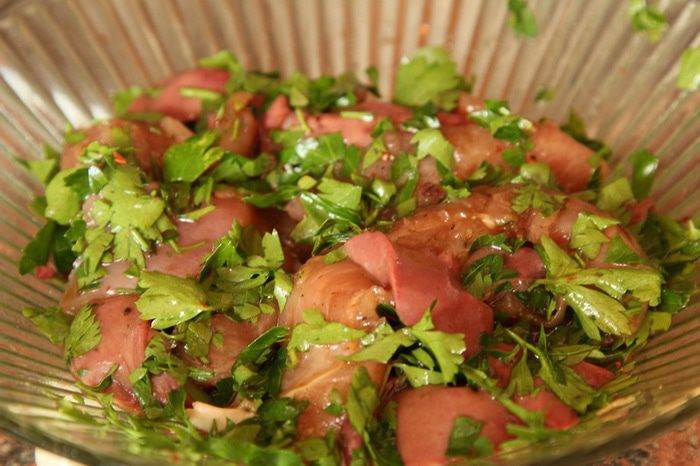 Теперь берем маринованную начинку и проталкиваем внутрь филе. Войдет много!