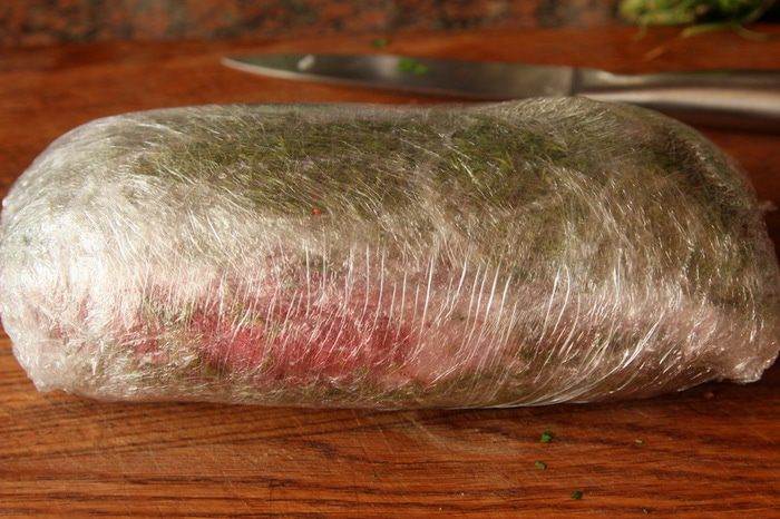 Тщательно упаковываем в несколько слоев пищевой пленки (не жалеем) и получаем кокон.