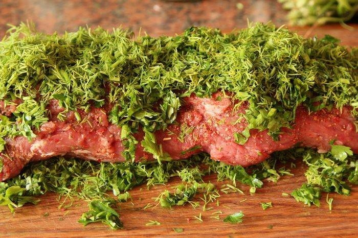 Выстилаем пищевую пленку, сверху выкладываем рубленую петрушку и укроп, затем наше филе и снова рубленую зелень.