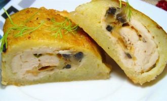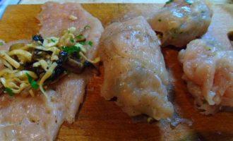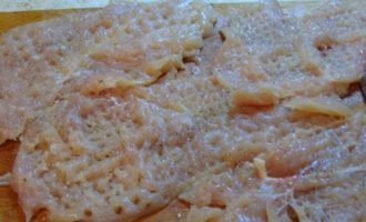 Куриную грудку нарезаем как на биточки, отбиваем, солим и перчим по вкусу.