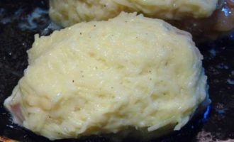 Затем раскладываем поверх котлеты картофель, прижимая руками. Картофель очень хорошо держится, и обжариваем на хорошо разогретой сковороде с добавлением растительного масла, с двух сторон до золотистости.