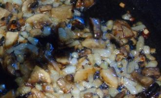 Лук и грибы нарезаем и обжариваем на разогретой сковороде на 1 ст. л. масла растительного до золотистого цвета, солим и перчим по вкусу.