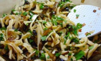 Сыр натираем на терке и смешиваем с грибами и луком, добавляем зелень, у меня петрушка.
